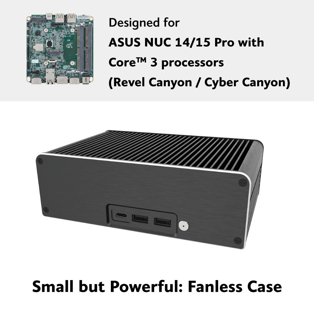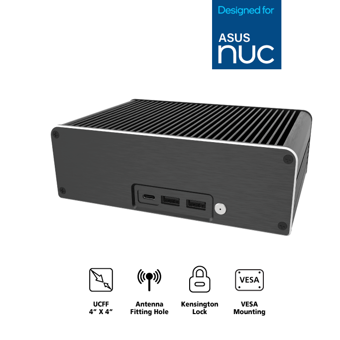 Fanless case for ASUS NUC 14/15 Pro models with Core™ 3 processors up to 15W TDP. Features full interface and VESA mounting support.