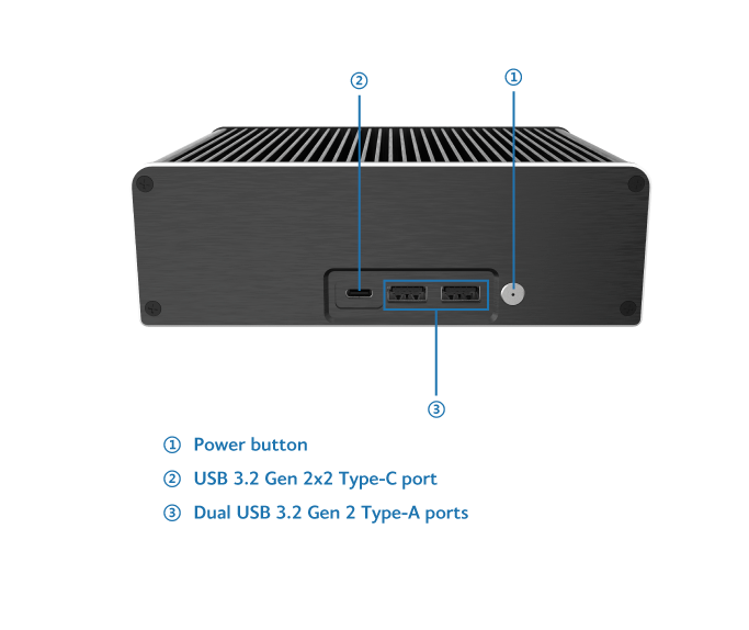 | Front I/O Interfaces | Power button, power and HDD LED, USB 3.2 port x2, USB 2.0 port x2, USB 3.2 Gen 2x2 Type-C port |