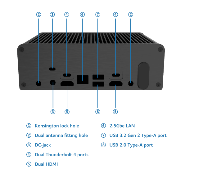 | Rear I/O Interfaces | DC-In port, HDMI port x2, USB Type-A port x2, USB Type-C x2, LAN port x1, Serial port x1 |