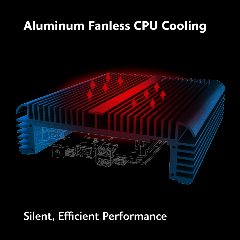 Featuring a cutting-edge aluminum fanless CPU cooling design, ensuring silent and efficient operation. This advanced cooling solution combines exceptional heat dissipation with a sleek, modern aesthetic, delivering both performance and style for your fanless system setup.