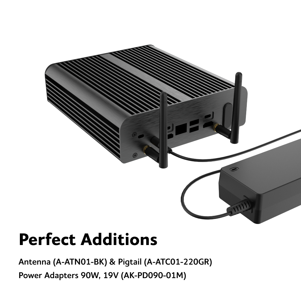 Optional hi-quality external antenna (A-ATN01-BK) and corresponding pigtail (A-ATC01-150GR) to connect the antenna to the Wi-fi connector. Perfect additions for your fanless ASUS NUC build should a wireless connection be required.