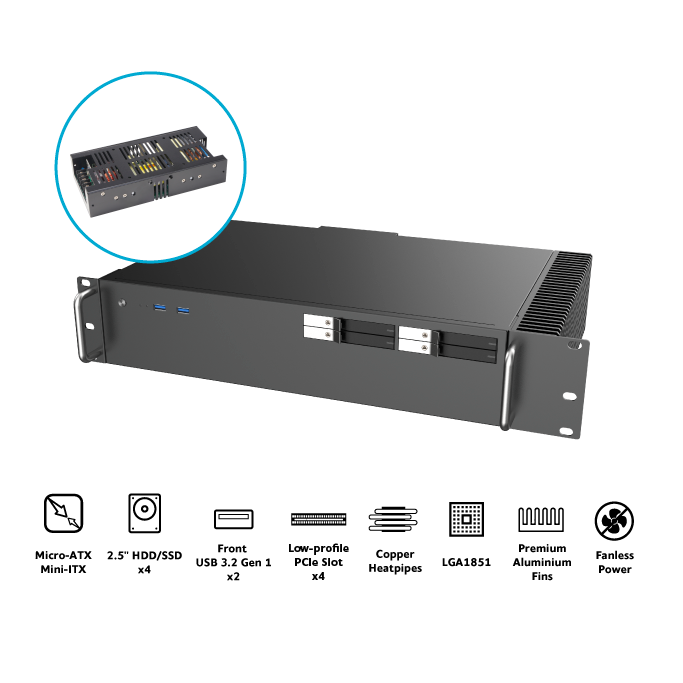 2U Rackmount Fanless Micro-ATX Case for Intel® Core™ (Ultra) Processors with Fanless ATX Power Supply
