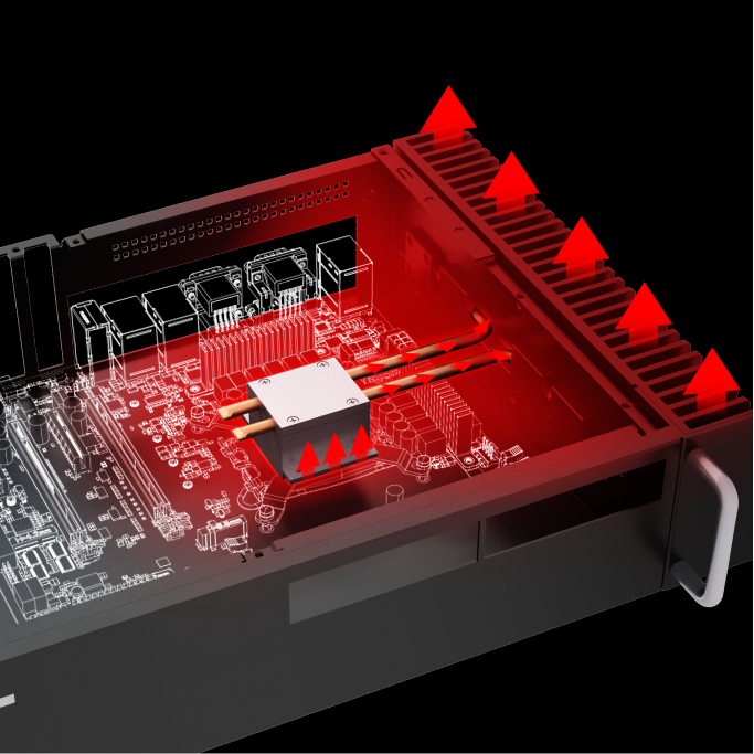 High-performance aluminium thermal module and dual copper heatpipes transfer heat efficiently from the CPU to the external aluminium fins, increasing surface area for rapid dissipation into the surrounding air without any moving parts.