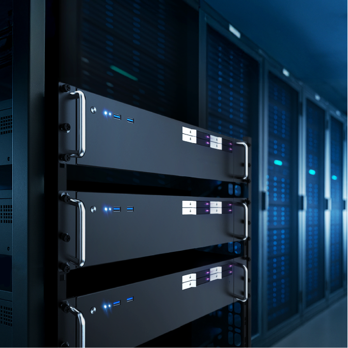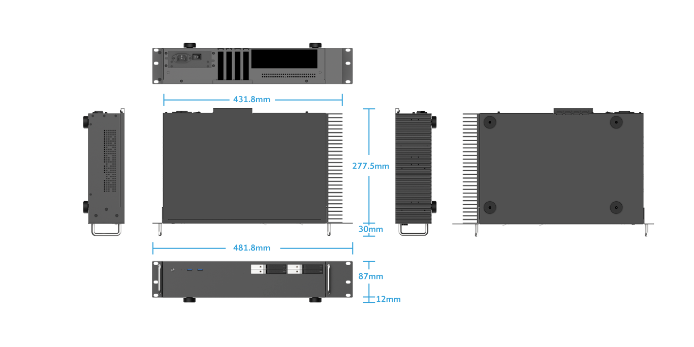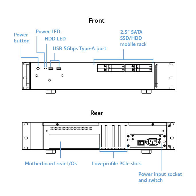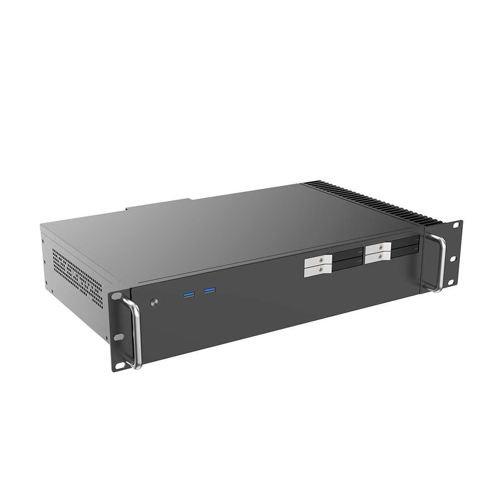 2U profile height, rackmount case with convenient pull-out handlebars. Fits in standard 19" server racks.