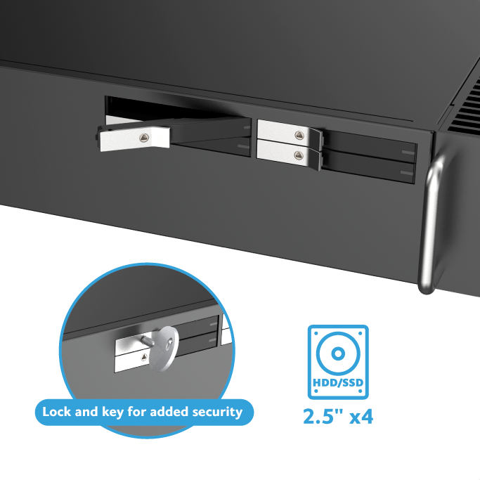 Supports up to four 2.5" SATA SSDs/HDDs (up to 9.5mm height) with designated, lockable, tray front flaps for easy, tool-less mounting with hot-swap capabilities.