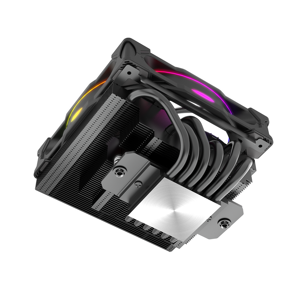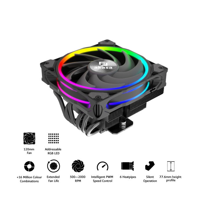 Top-down cooler design features a dense aluminium heatsink, six copper heatpipes and a striking SOHO AR fan for efficient heat dissipation.