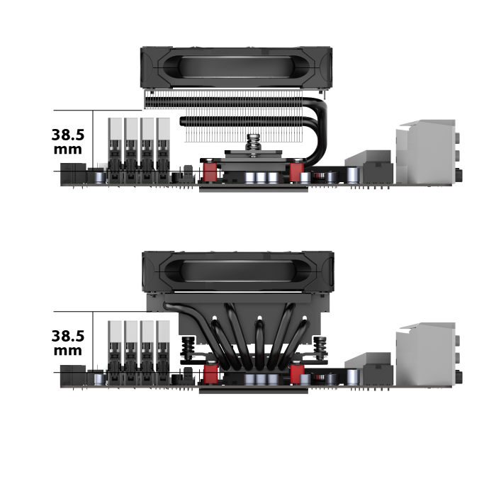Efficient cooler footprint offers maximum RAM clearance, allowing for total use of all available RAM slots, even in systems with limited clearance.