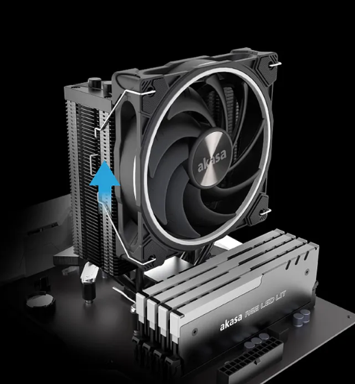 Inside the box, a SOHO AR fan is also included, a part of the SOHO range at Akasa. Installation is as easy as pie; simply snap the fan onto the cooler and plug the fan into the motherboard! The fan can be elevated on the cooler for RAM clearance, and a second fan can also be attached to the opposite side for even better heat dissipation.