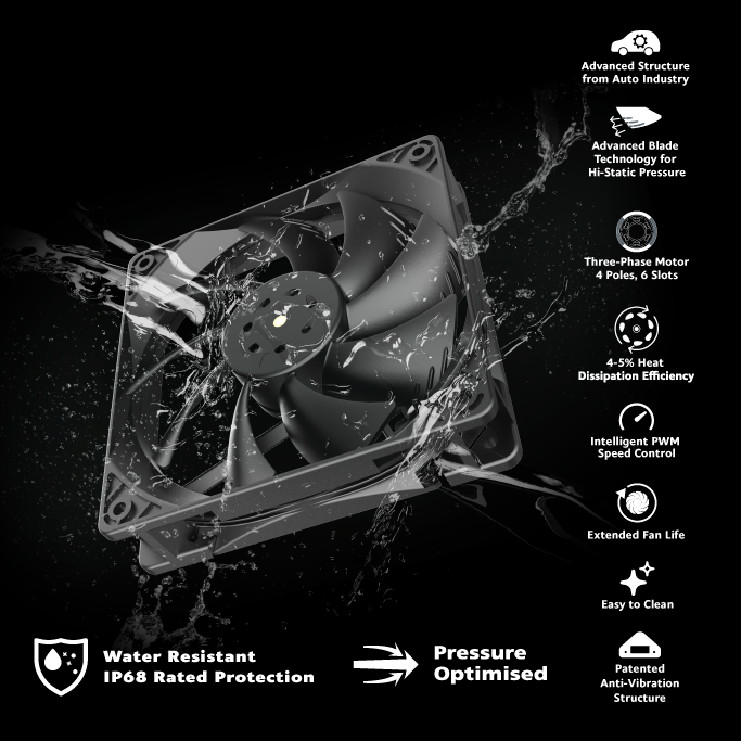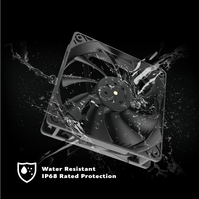 Ultra premium 120mm black fan for heatsink and radiator cooling, featuring advanced structure design derived from the automobile industry. IP68 rated water and dust proof.