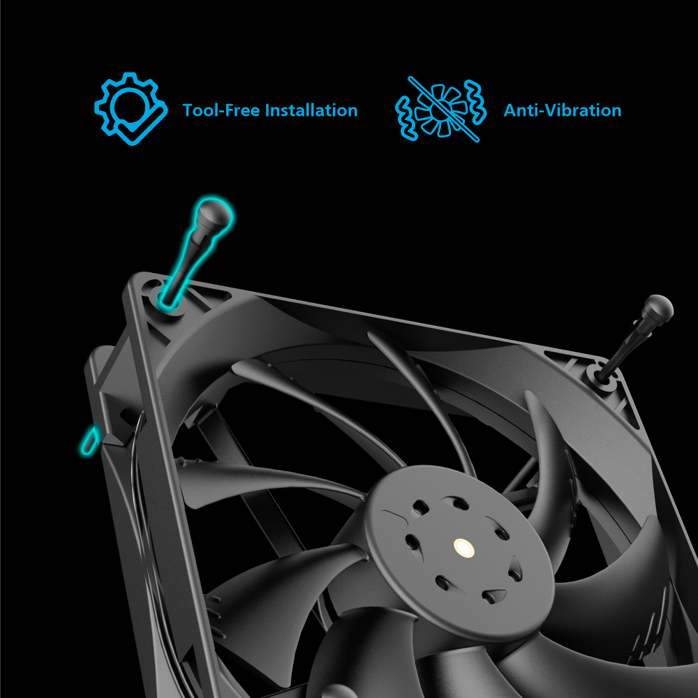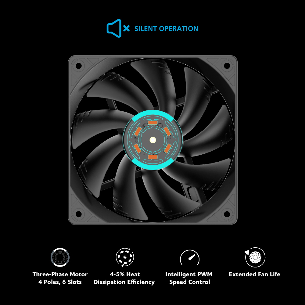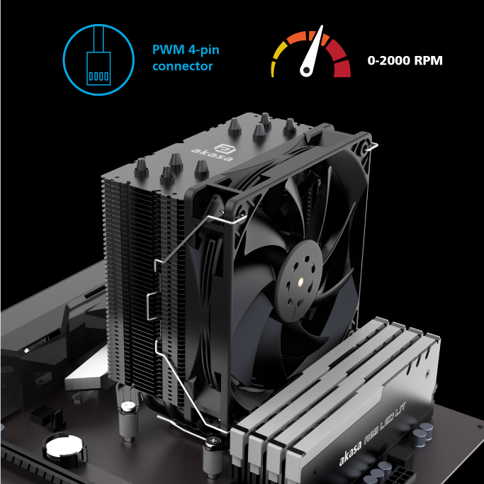 Intelligent PWM speed control ranging from 0-2000 RPM, ensures efficient and silent cooling delivery during higher and lower loads. Connected via a 4-pin connector.