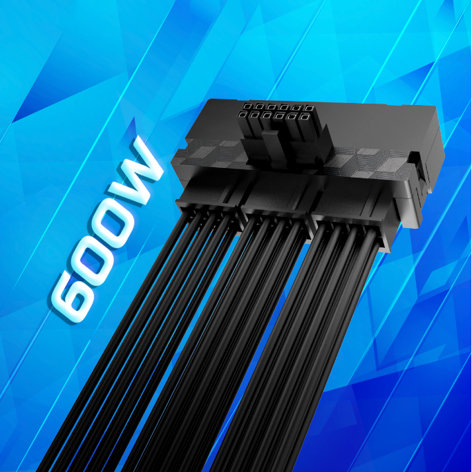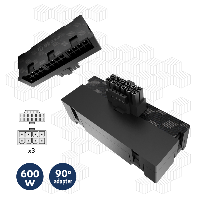 Innovative 12VHPWR connector that allows you to easily improve the aesthetic and cable management with a 90-degree 12+4-pin to three 8-pin adapter. Supporting up to 600W of power.