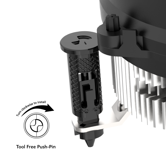 The push-pin mounting design offers a quick, secure, and hassle-free installation with no tools required. Simply align the cooler and push the pins down to secure them into place.