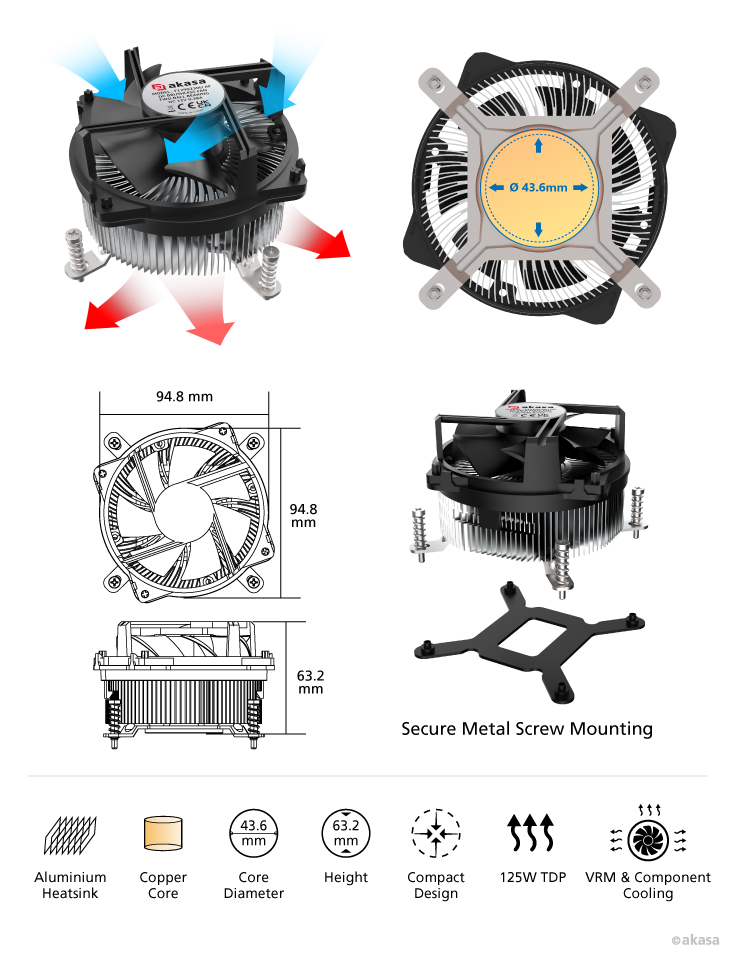 The new LGA1700 socket caters for processors with larger package sizes compared to previous desktop processor generations. To ensure maximum contact and thermal transfer, Akasa has increased the contact area between the cooler core and the processor in order to maximise heat dissipation and cooling performance.