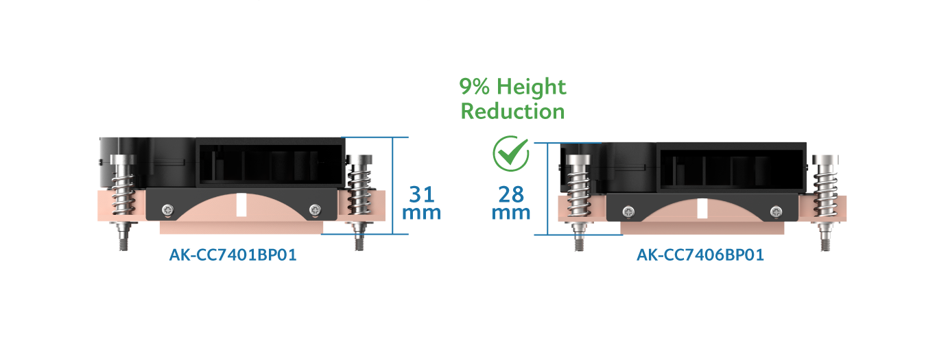 Ideal for the most confined enclosures and server chassis, boasting an overall CPU cooler height of 28mm. Representing a 9% reduction in height when compared to the AK-CC7401BP01 model.