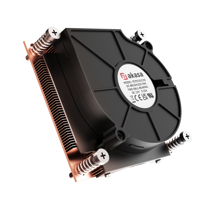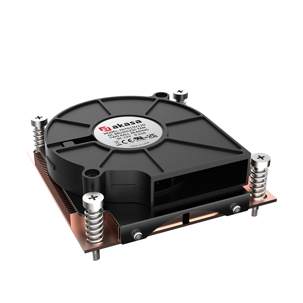 1U Low profile CPU cooler at 28mm height with side blower fan for Intel® LGA1700 socket, up to 95W TDP. Featuring spring-loaded screws for added stability and a copper heatsink for increased thermal conductivity.