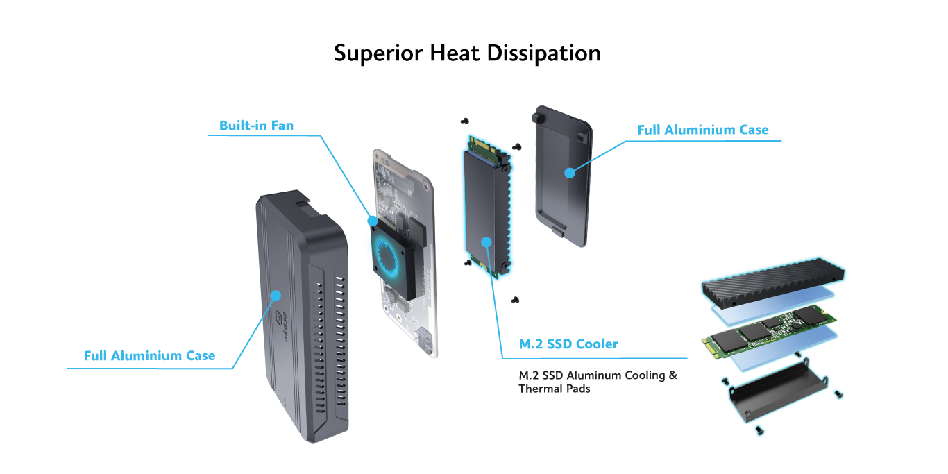 SSD enclosure offers hyper-fast data transfer speeds and broad compatibility across devices and platforms, all in a compact design with advanced cooling and reliable connections. Ideal for high-performance storage on the go.
