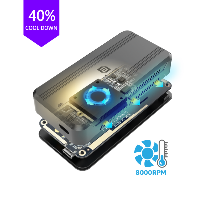 Our enclosure features a high-performance cooling system with an 8000RPM fan to prevent overheating and ensure optimal performance during intensive tasks.