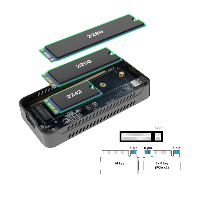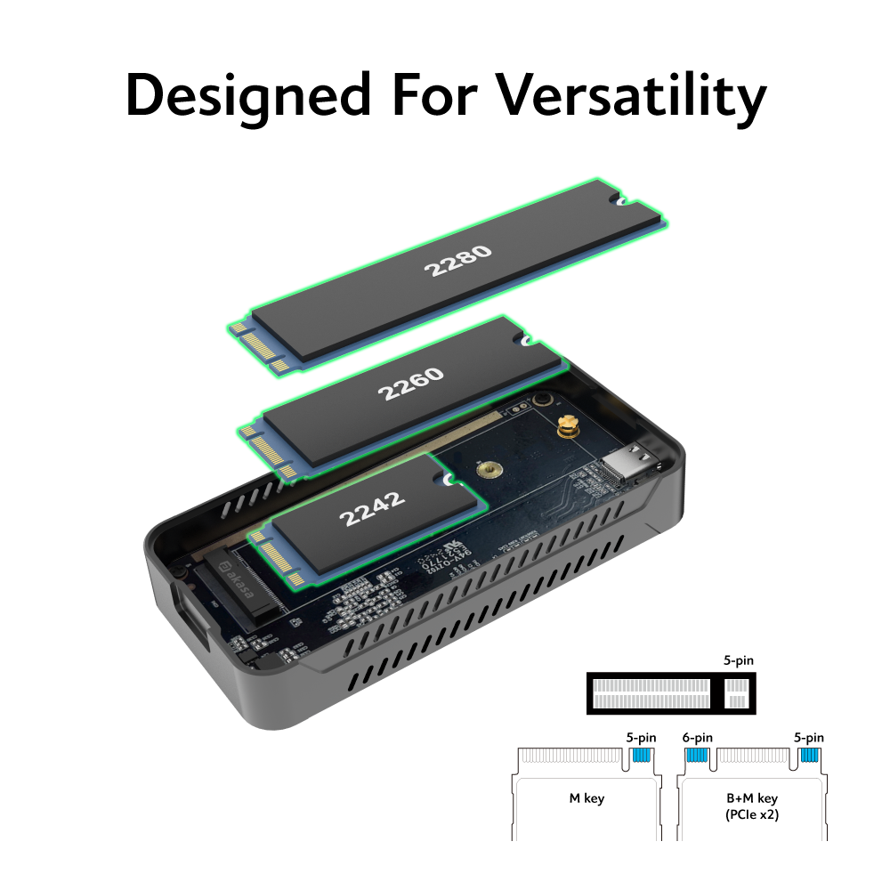 This enclosure supports different M.2 PCIe NVMe SSD sizes, including 42mm(2242), 60mm(2260), and 80mm(2280), offering a flexible and efficient storage solution for any need. Easily upgrade or expand your storage, confident that it fits a wide range of high-performance SSDs.