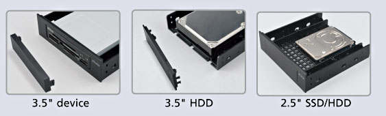 Application Mounts single 3.5" device, 3.5" HDD or 2.5" SSD/HDD in a 5.25" PC bay