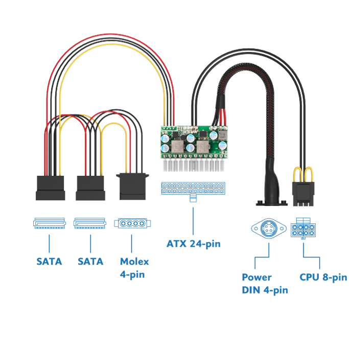 | Connectors | ATX 24-pin Power DIN 4-pin (300 mm) CPU 8-pin (300 mm) SATA + SATA + Molex 4-pin (265+170+150 mm) |