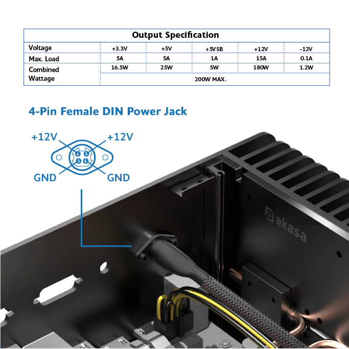 200W, 12V DC-to-DC ATX power supply adapter with 4-pin power DIN design for small form factor chassis. Highly efficient power transfer with over power and over voltage protection.