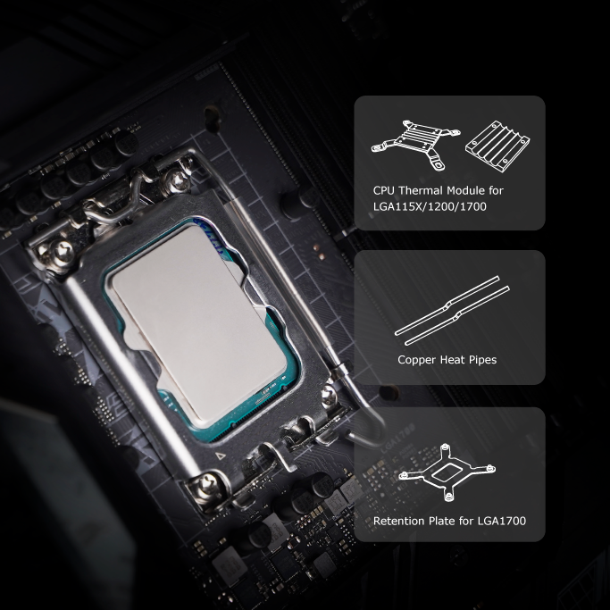 Perfect for low-powered T-series Intel® Alder Lake processors up to 35W Thermal Design Point (TDP). Featuring an upgrade thermal module to cater for increased contact surface area and mounting pattern for LGA1700.