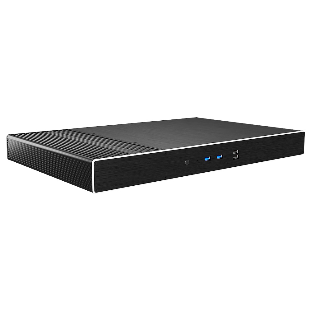 Slim 1U fanless case for commercial and industrial thin mini-ITX motherboards. Massive storage with four internal 2.5'' drives. Sleek design mixed with hi-dissipation thanks to the premium aluminum.