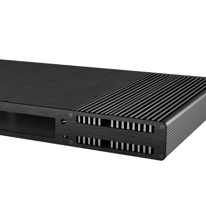 1U rack-mountable fanless case for commercial and industrial thin mini-ITX motherboards. Massive storage with four internal 2.5'' drives. Sleek design mixed with hi-dissipation thanks to the premium aluminum.