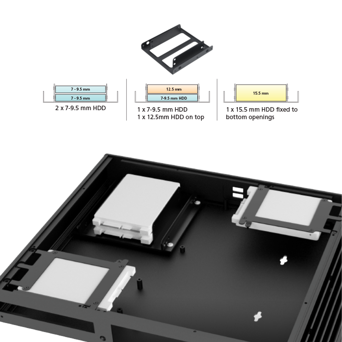 | Drive Bays | Four internal 2.5" HDD / SSD bays (max height of 15.1 mm) |