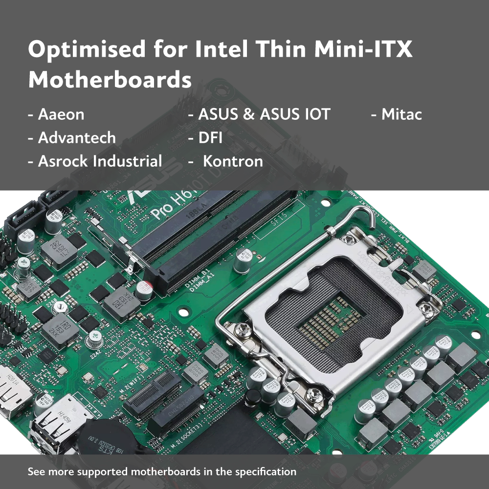 Designed to support a diverse range of both current and legacy Intel Thin Mini-ITX motherboards, the Euler CTX caters to various segments, including pro-business, industrial, and long-life motherboards. Compatible models include those manufactured by: