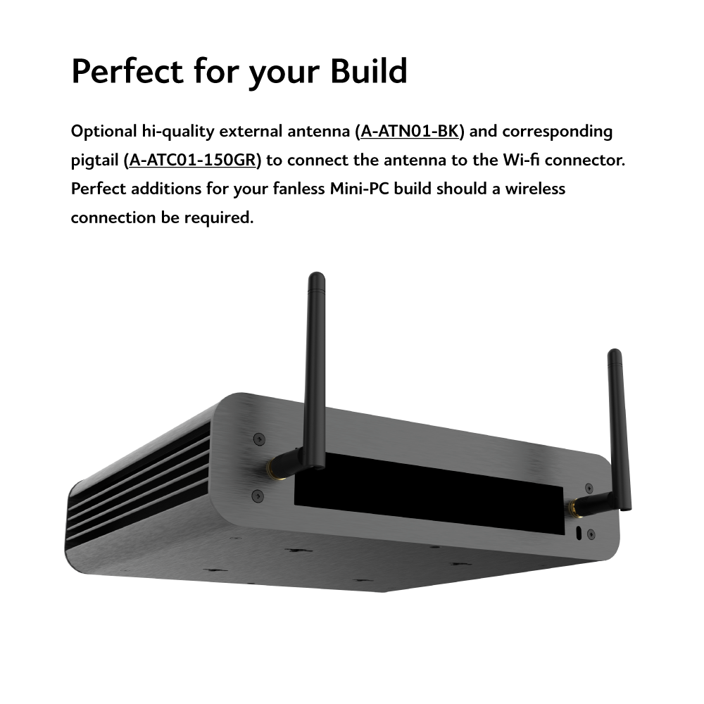 Optional hi-quality external antenna (A-ATN01-BK) and corresponding pigtail (A-ATC01-150GR) to connect the antenna to the Wi-Fi connector. Perfect additions for your fanless build should a wireless connection be required.