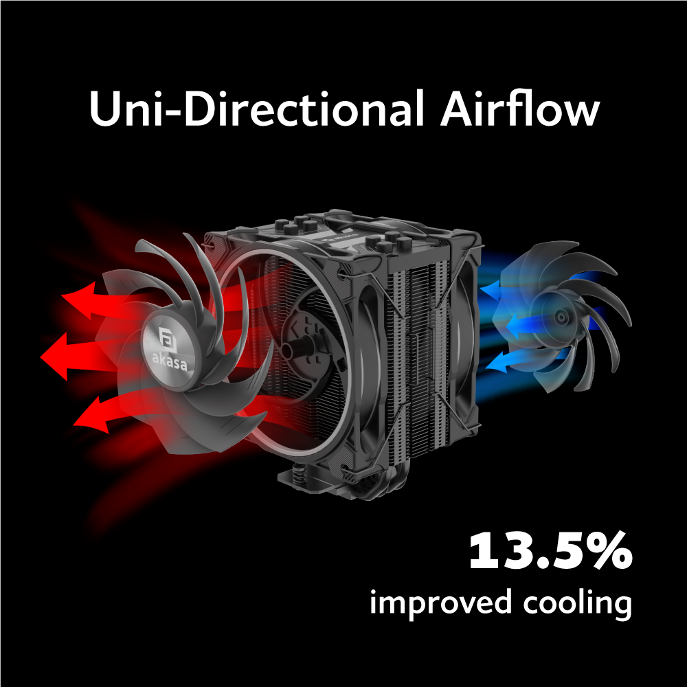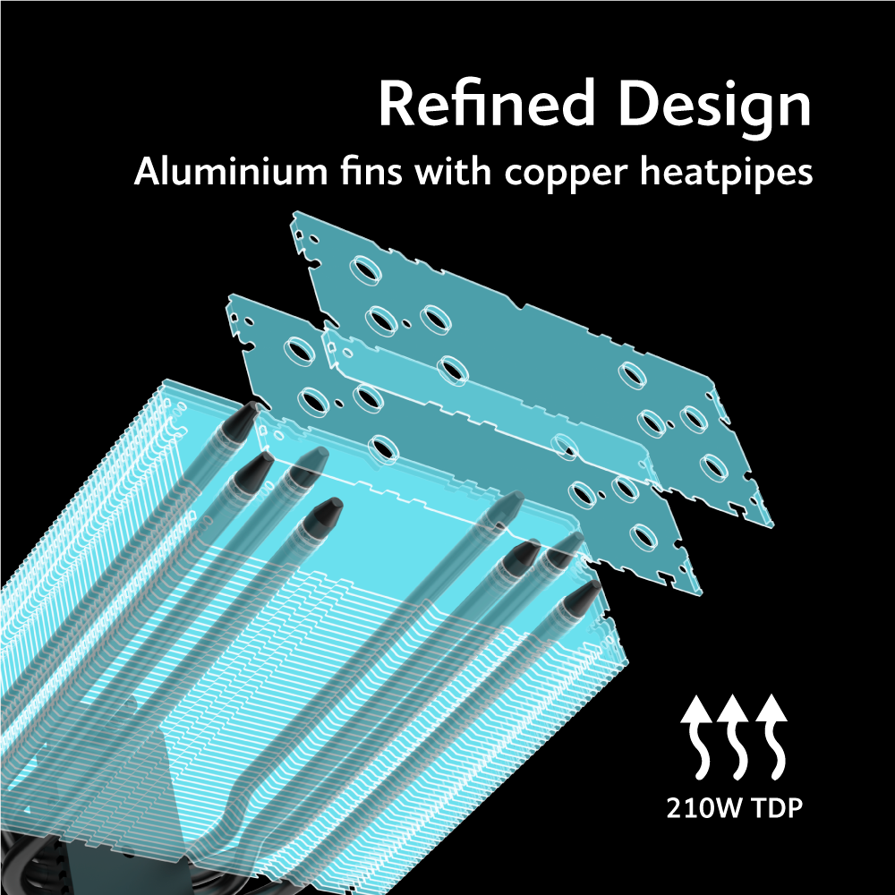 Featuring a unidirectional airflow design with our SOHO AR12 reverse blade. Which assists the flow of air inside the case for a 13.5% improved cooling, up to a max TDP of 210W.