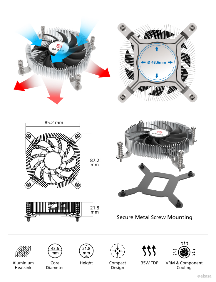 Ultra low-profile 21.8mm heatsink with embedded fan provides low-noise compact cooling solution for Intel® LGA1700 processors up to 35W TDP in thin mini-ITX and SFF chassis.